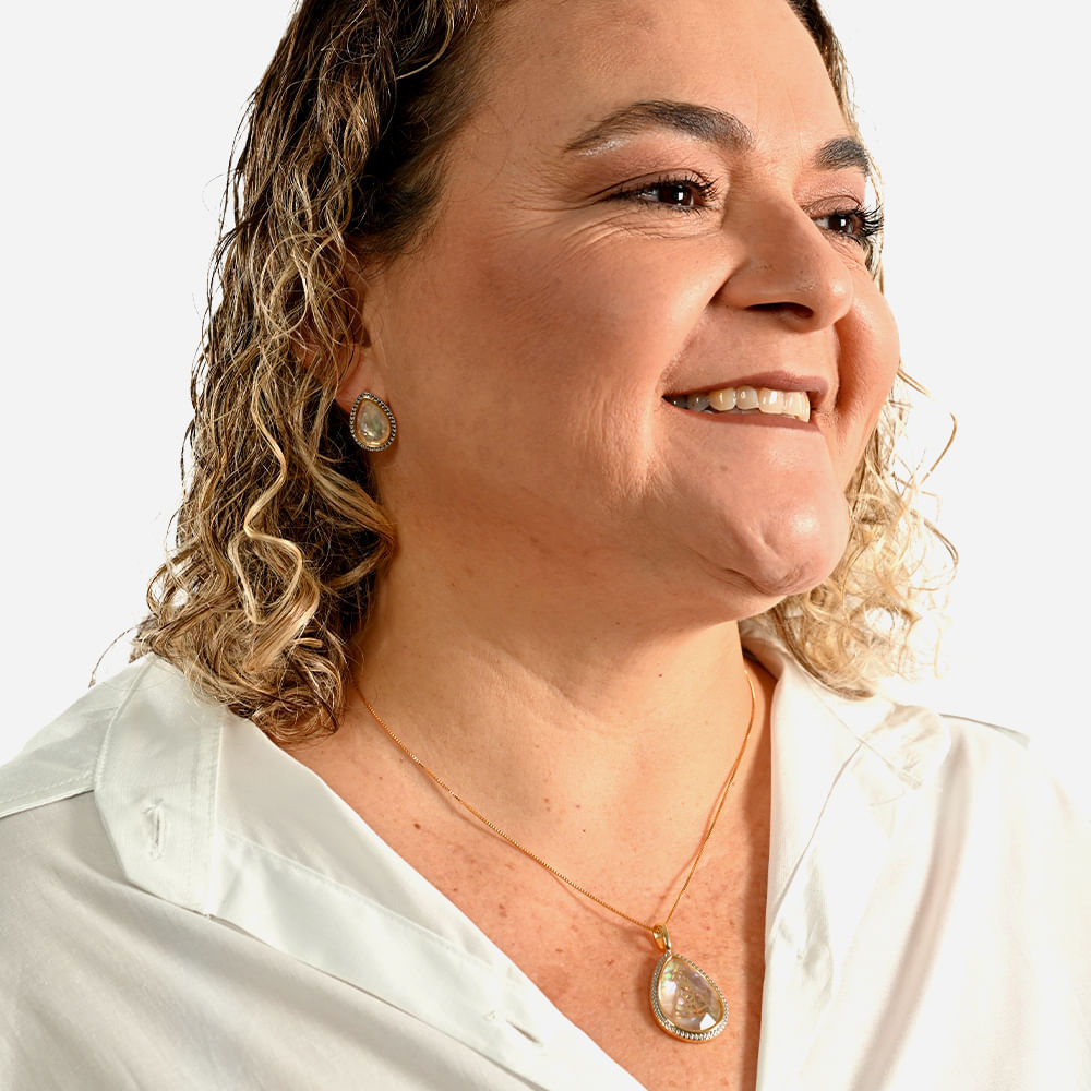 O Conjunto Luz de Maria é composto por um par de brincos ovais dourados e um colar com pingente em formato de gota, feito com pedra opala do mar, com a Imagem de Nossa Senhora Aparecida sobreposta.