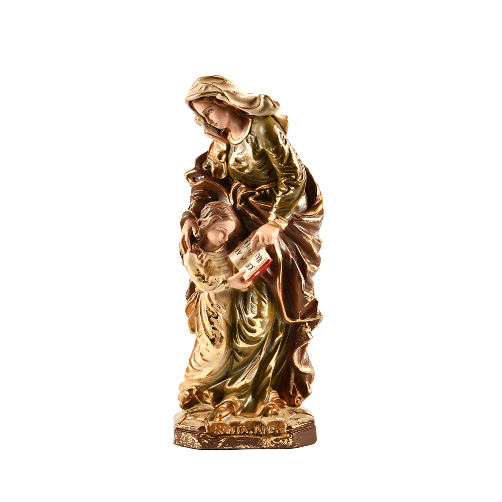 Imagem de Santa Ana, a avó de Jesus e padroeira dos avós. Confeccionada com traços clássicos e acabamento refinado, esta peça representa a sabedoria e a proteção da linhagem sagrada. Ideal para altares domésticos ou para presentear em celebrações familiares.