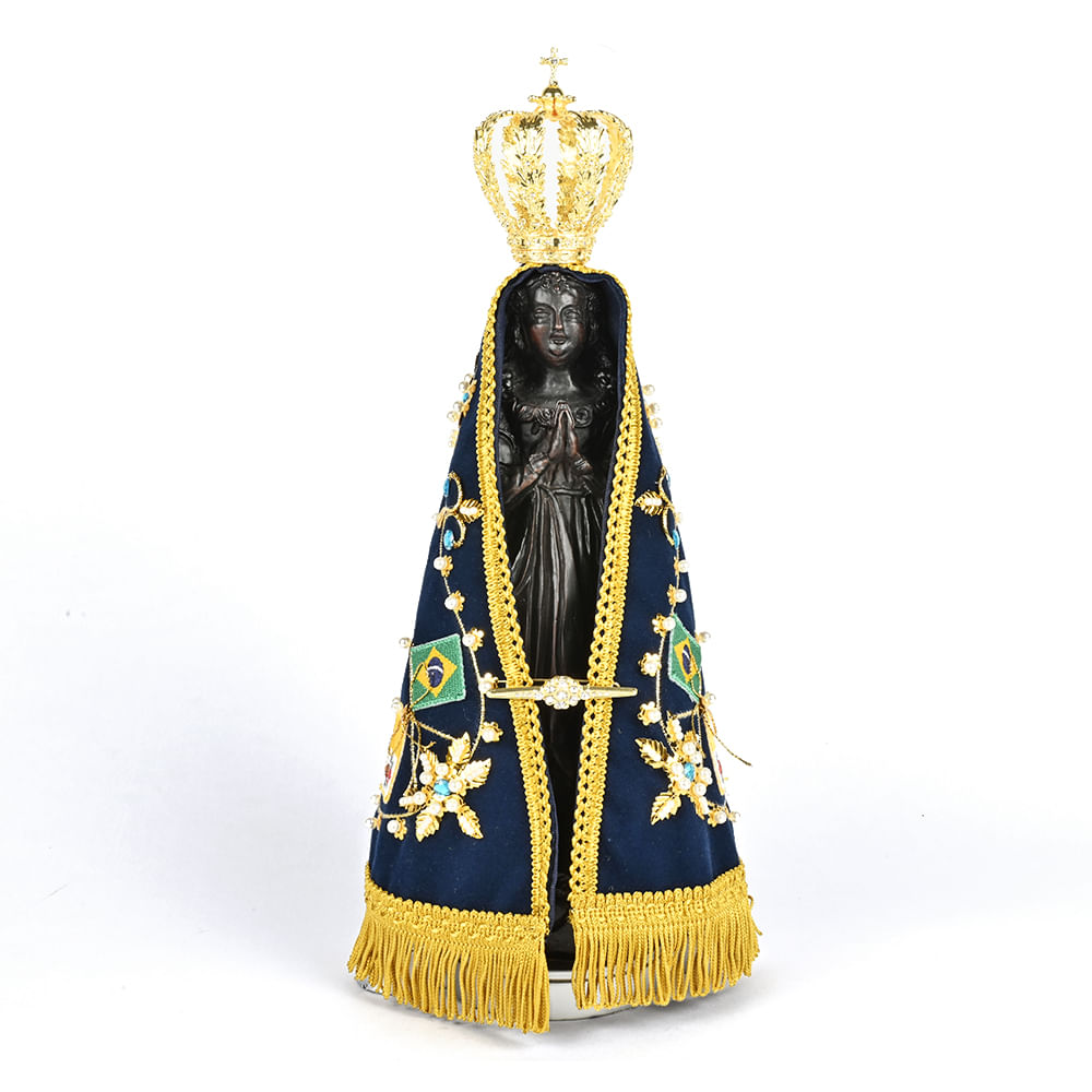 O grande diferencial reside no manto exclusivo, bordado à mão pelas artesãs do próprio Santuário Nacional, tornando cada peça uma obra de arte única. A coroa e o broche possuem acabamento dourado impecável, adornados com pedras de strass que refletem a luz e a glória da Rainha do Brasil.