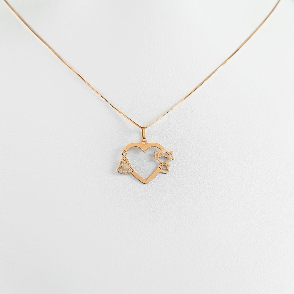 O pingente amor materno um delicado coração confeccionado em ouro 18k que carrega, de um lado, a imagem de Nossa Senhora Aparecida e, do outro, uma menina. Uma joia que simboliza proteção, carinho e o amor único entre mãe e filha, guardado para sempre junto ao coração.